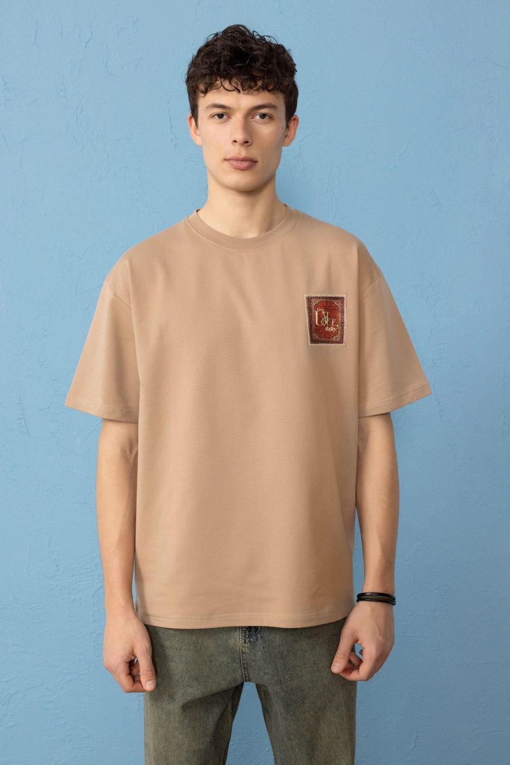 Minimal Baskılı Bej Oversize Erkek T-shirt
