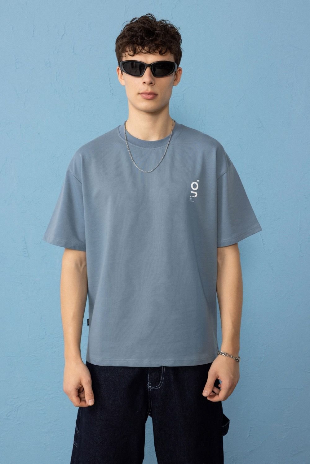 Minimal Baskılı İndigo Oversize Erkek T-shirt